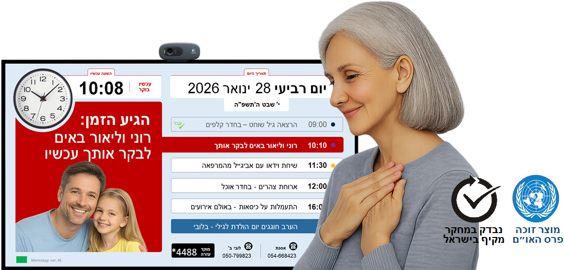 סייע מאוד לאשתי במהלך השנים האחרונות ממליץ מאוד! - מזה מעל שנתיים שאני מבצע שימוש יומי במערכת MEMOAAP כדי לתת לאשתי את המידע היומי על הפעילויות והמשימות הצפויות באותו היום. היה לנו טקס בבוקר מול המסך שכלל: "בוקר טוב עולם----מה שלום כולם" ולאחר מכן שוחחנו (עד כמה שניתן ) על הצפוי לנו. אין ספק שמידע זה סייע מאוד לאשתי חולת אלצהיימר ודמנציהבמהלך השנים האחרונות.