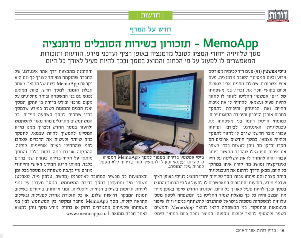 כתבו עלינו במגזין 'דורות'... 'דורות' הוא כתב העת המקצועי המוביל בישראל בתחום הגיל השלישי ומעניק מדי גיליון במה למיטב אנשי המקצוע בתחום הגיל השלישי, מביא עדכונים על מחקרים חדשים בתחום הזקנה, אקטואליה, רווחה, בריאות ועוד. בגיליון אפריל 2019 מופיעה כתבה אודות 'ממואפ' והתרומה שלו למשתמשים בני הגיל השלישי.
